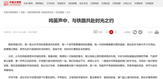 征集展示活动自今年9月25日开始,至11月30日结束,历时两个多月。其间,广大网友、旅客积极参与,用灵动的文字作品讲述生动鲜活的“我的铁路风景”故事;各承办平台共征集原创作品2万余个,遴选展示6000余个,全网话题传播量超4亿次。近日,活动承办平台“学习强国”学习平台、新华网客户端、中国青年报客户端、中国日报网、未来网、中国文明网、微博、《人民铁道》报业有限公司、中国铁道出版社有限公司、中国铁道博物馆、“中国铁路”及各铁路局集团公司新媒体平台,对遴选展示的作品进行了阅评,经活动组委会认定,最终产生了252件优秀作品。